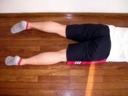 - 足をまっすぐ伸ばしてにして、お尻とふとももに力を入れてふとももを床から離しましょう。